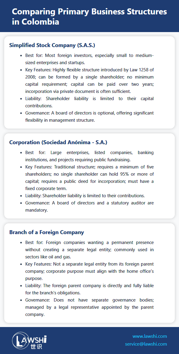 The Colombian commercial landscape offers several entity types, with three primary structures dominating the market for foreign investment. The Simplified Stock Company (Sociedad por Acciones Simplificada - S.A.S.) has emerged as the preferred vehicle due to its administrative flexibility and streamlined incorporation process. This structure permits significant customization of internal governance arrangements and operational terms through its bylaws.