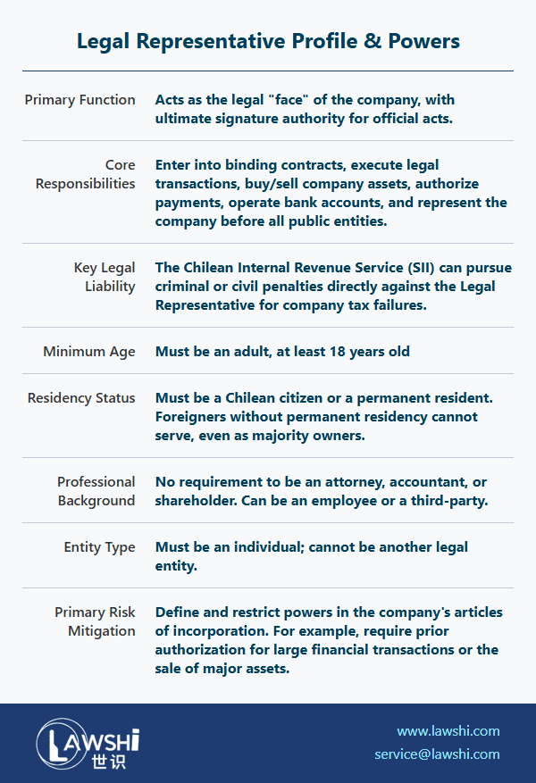 The role of a legal representative in a Chilean company is both powerful and fraught with potential pitfalls. For foreign investors, understanding the legal framework and implementing prudent safeguards is critical to protecting their investments. By defining the scope of authority, incorporating checks and balances, and seeking professional guidance, companies can leverage the benefits of this role while minimizing associated risks. As always, proactive legal planning is the key to successful and secure business operations in Chile.