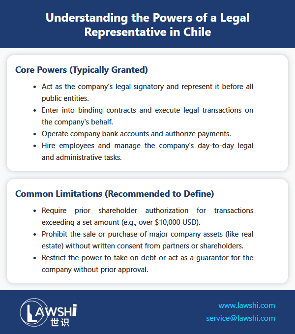 The role of legal representative in Chile combines statutory requirements with strategic importance, making careful selection and ongoing management essential components of successful market entry and operation. By understanding the full scope of responsibilities and implementing appropriate oversight mechanisms, companies can leverage this requirement to establish strong compliance foundations while maintaining effective operational control.