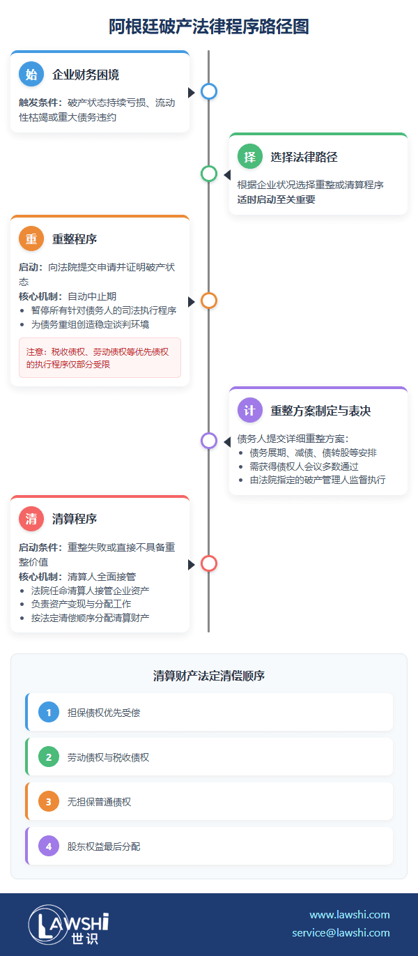 阿根廷破产法律体系以《破产法》为核心,确立了重整与清算并行的双轨制。重整程序旨在帮助暂时陷入财务困境但仍有持续经营能力的企业实现债务重组,而清算程序则适用于无法挽救的企业,通过资产变现实现有序退出。