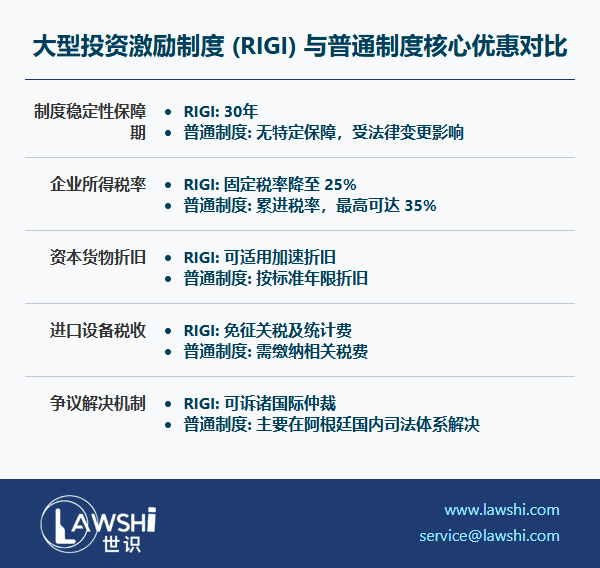 大型投资激励制度(RIGI):这是新近出台的、最具吸引力的政策工具之一。该制度为在林业、旅游、基础设施、矿业、科技、钢铁、能源和油气等领域投资额超过2亿美元的项目,提供为期30年的税收、海关和外汇监管稳定性保障。优惠包括企业所得税率降至25%、资本加速折旧、增值税退税、进口设备免税等,并为与国家的争议提供国际仲裁解决机制。这为大型长期投资项目提供了前所未有的法律确定性和成本可预测性。