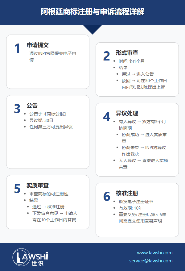 主管机关:阿根廷国家工业产权局(INPI)统一负责商标事务,官方语言为西班牙语。