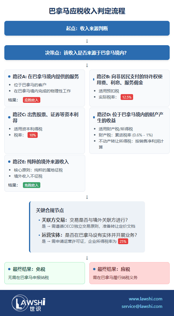 在巴拿马境内从事商业活动或提供服务的企业,无论其国籍或运营办公室所在地,均需就其在巴拿马领土内活动产生的所得纳税。非居民获得的收入,如果源于为位于巴拿马的个人或公司提供服务,包括费用、利息和特许权使用费,均被视为巴拿马来源收入。