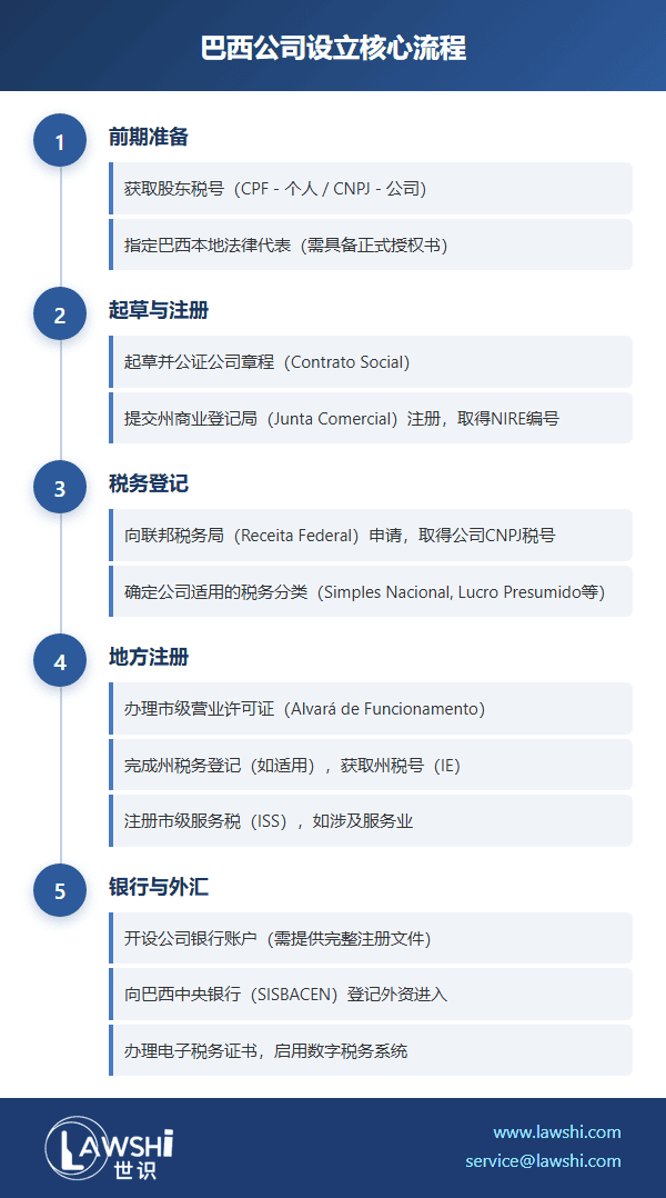 在巴西设立公司通常需要经过以下关键步骤:确定公司形式并准备组织文件、获取股东及公司的税务编号、在商业委员会完成登记、办理市级营业许可及联邦税务注册,以及开立公司银行账户等。
