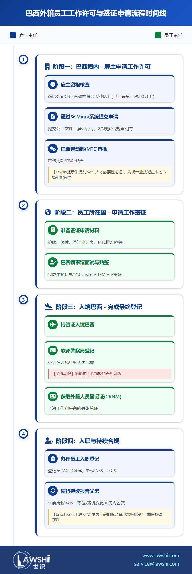巴西的工作许可制度采用独特的“双轨审批”模式,雇主和员工需要分别完成两个独立但相互关联的法律程序。