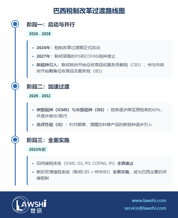 现行税制将在2026-2032年期间逐步过渡。PIS/COFINS将于2027年废止,ICMS和ISS将在2029-2032年期间逐步降至原税率的60%。新的选择性税IS将针对烟草、酒精等产品征收。