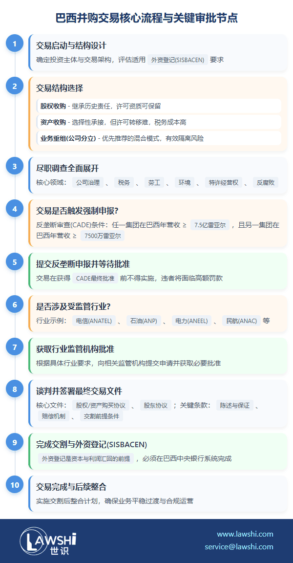 巴西的并购协议深受普通法实践影响,条款详尽。除价格、交割条件、陈述保证和赔偿等核心条款外,股东协议、托管协议和过渡服务协议是常见的附属文件。