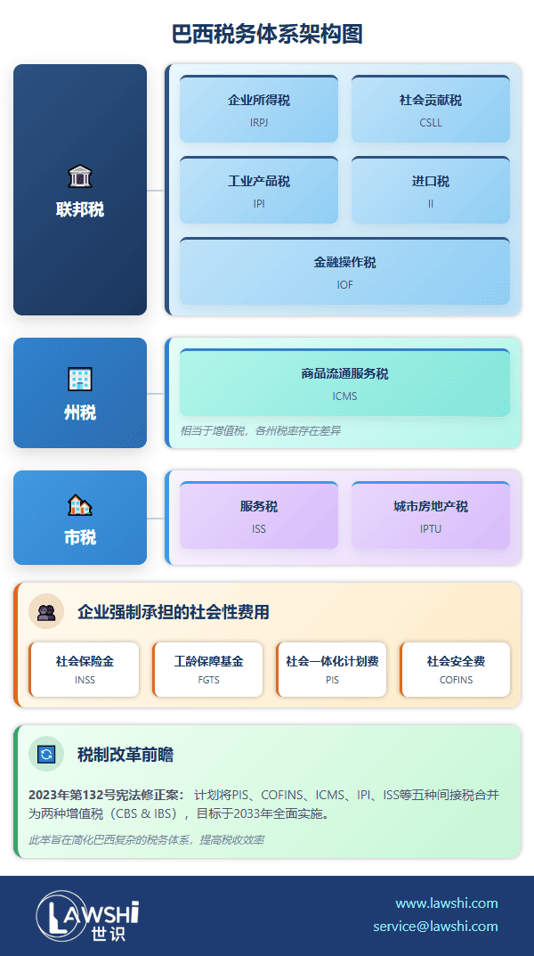 主要联邦税:企业所得税(IRPJ)、社会贡献税(CSLL)、工业产品税(IPI)、进口税(II)、金融操作税(IOF)等。