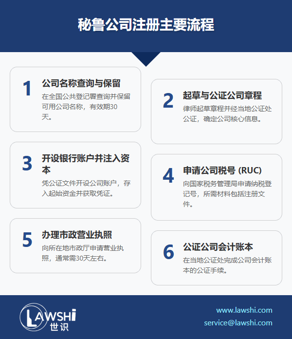 公司注册:向SUNARP提交公证书等文件,审批时间约15个工作日。