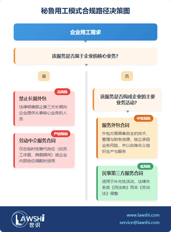 法律明确禁止第三方长期向企业提供从事核心业务的人员。仅在临时性替代岗位(如员工休假、病假期间)或企业内部岗位调配时,才允许通过劳动中介形式使用外部人员从事核心业务。企业若误用该模式,可能被认定为事实劳动关系,从而承担连带工资支付、社保缴纳等法律责任。