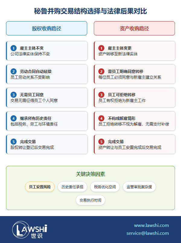 员工安置问题完全取决于交易结构。在股权收购中,雇主主体未变,员工劳动合同自动延续,无需通知或征得同意。但在资产收购中,人员的转移则必须获得每位员工的明确同意。
