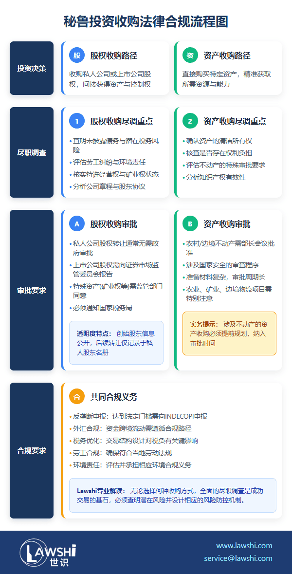 随着“一带一路”倡议的深化与中拉合作的不断加强,秘鲁以其丰富的自然资源和稳定的经济环境,正成为越来越多中国企业出海布局的重要目的地。无论是参股当地优质企业,还是直接收购核心资产,理解并遵守秘鲁当地的法律监管框架是投资成功的基石。 Lawshi律师事务所凭借在拉丁美洲深厚的法律实务经验,特此为中国企业梳理在秘鲁进行投资收购所必须掌握的法律要点。