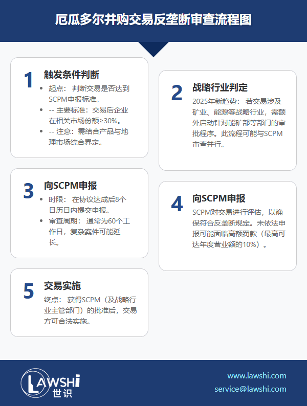 厄瓜多尔市场力监管局(SCPM)是并购交易的主要监管机构,依据《市场力规制和控制组织法》行使审查权。当交易涉及的企业在相关市场的份额达到或超过30%阈值时,交易方须在协议达成后8个日历日内向SCPM提交申报。审查周期通常为60个工作日,复杂案件可能延长。