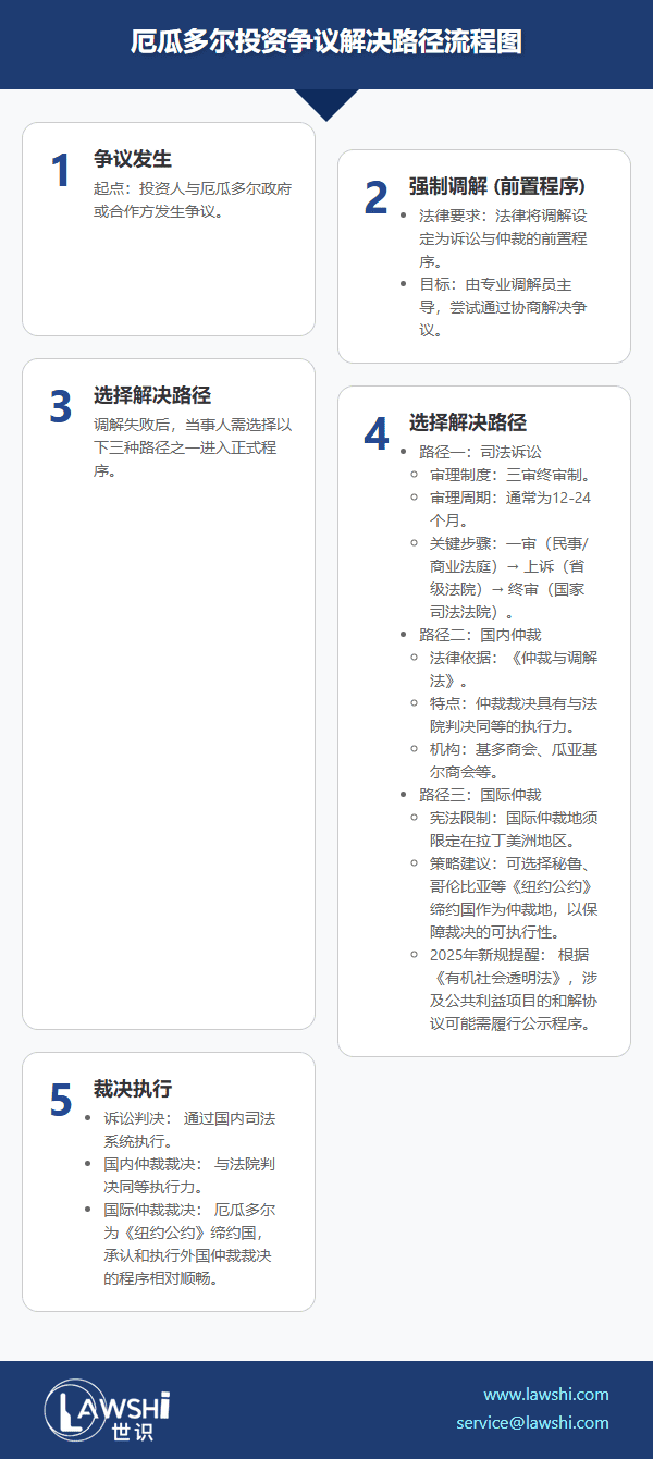 厄瓜多尔作为投资目的地具有独特法律环境,2017年取消包括中国在内的双边投资协定后,中国投资者需更加注重通过合同条款和本地司法程序保护自身权益。本文将系统分析厄瓜多尔诉讼与仲裁机制,为投资者提供争议解决的全景指引。