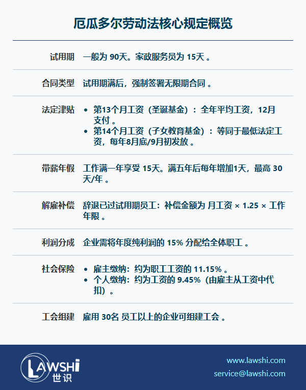 厄瓜多尔劳动法律体系以宪法为基础,构建了完善的劳动者权益保障机制。随着2023年《劳动改革法案》的实施,企业在用工管理方面面临新的合规要求。本文将深入解析厄瓜多尔劳动法核心规定,为外资企业提供全面的合规指引。