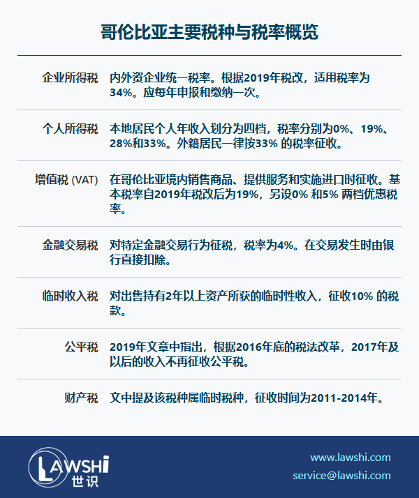 哥伦比亚实行以中央税为主体的税收体系,地方政府仅享有有限的税种设置权。该国税收制度以所得税和增值税为核心,遵循居民税收管辖原则。即在哥伦比亚依法注册的法人实体以及税务居民个人,需就其全球所得承担纳税义务;而未在当地设立法人实体的外国企业及非居民纳税人,仅需就其来源于哥伦比亚境内的收入缴纳税款。