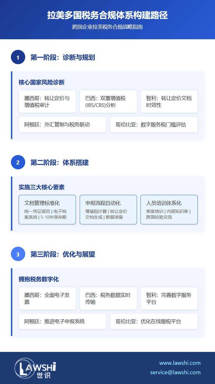 拉美税务环境正在经历深刻变革,企业需要从被动合规转向主动管理。通过建立系统化的合规体系、善用专业资源、把握数字化机遇,企业不仅能够有效控制风险,还可能在复杂的税务环境中获得竞争优势。