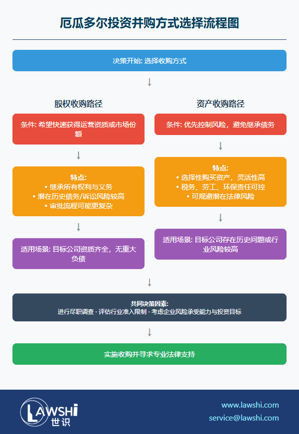 在厄瓜多尔,外国投资者可以选择通过股权收购或资产收购的方式进入市场。股权收购通常涉及目标公司的全部或部分股份,继承其所有权利与义务;而资产收购则更具灵活性,投资者可以选择性地购买资产,避免继承潜在的法律或债务风险。