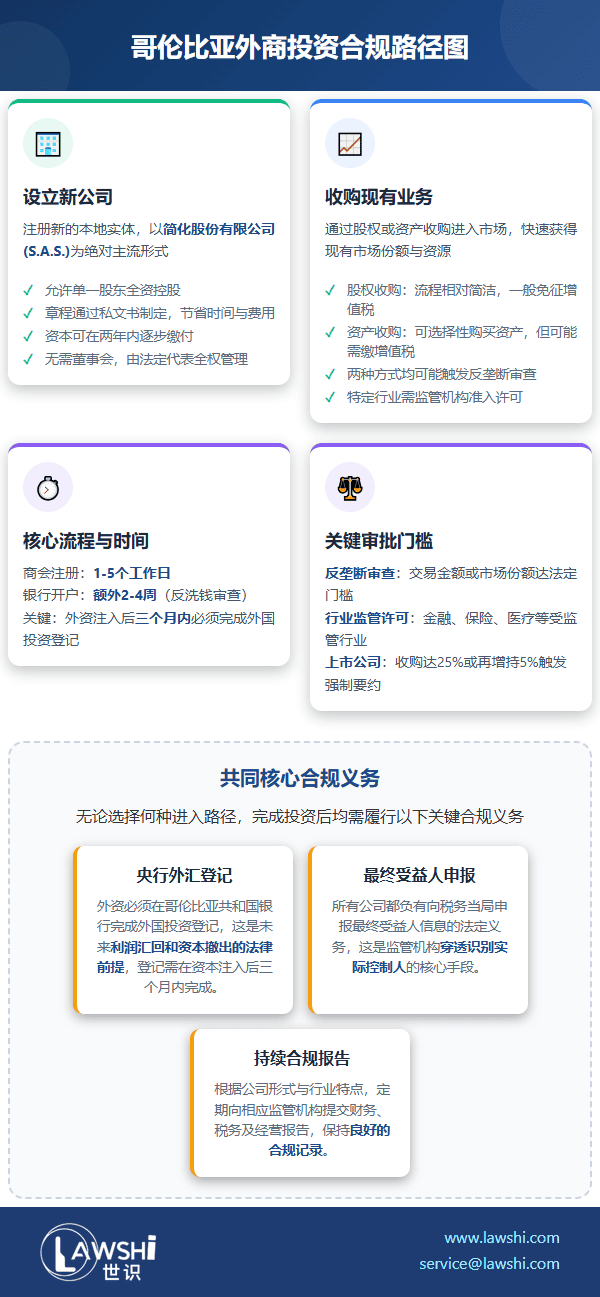 通过收购进入哥伦比亚市场是另一常见路径,但股权收购与资产收购在法律程序上截然不同。
