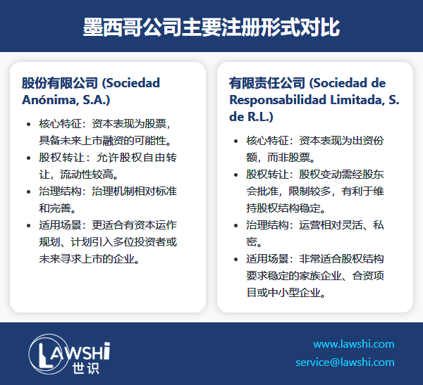 根据《墨西哥商业公司法》,外国投资者可选择的公司形式主要包括有限责任公司(S. de R.L.)和股份有限公司(S.A.)。这两种形式虽然都赋予股东有限责任保护,但在资本结构和治理机制上存在本质差异。