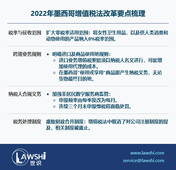 墨西哥2022年《收入法》的颁布标志着其增值税体系迎来重要变革,该法案虽未增设新税种,但对现有增值税法规进行了多维度调整,旨在提升税收征管效率并适应数字经济发展需求。此次改革涉及税率适用、进口业务课税规则、数字服务征管及财政合并制度等多个层面,对在墨经营企业尤其是跨境业务主体产生深远影响。