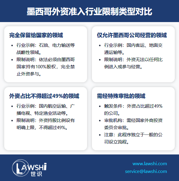 墨西哥对特定行业设有外资准入限制:石油等战略领域完全保留给国家;国内客运等行业仅允许墨西哥公司经营;航空运输等领域外资占比不得超过49%。值得注意的是,外资占比超过49%的公司需经国家外商投资委员会审批。