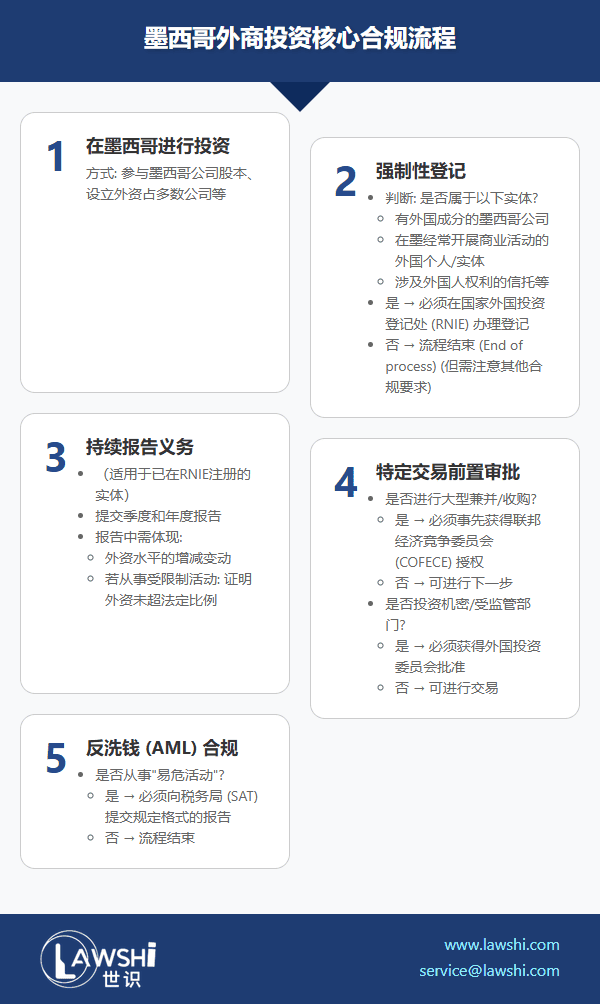 RNIE备案需提交经过公证的章程文件、外资来源说明以及董事会关于投资事项的决议。对于通过离岸架构持有墨西哥资产的情形,需特别注意最终受益人信息的披露要求。我们建议在交易完成后的30日内完成备案,逾期可能面临罚款等合规风险。