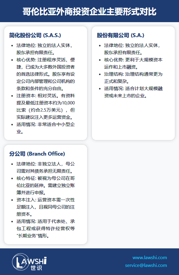 哥伦比亚对外国投资实行国民待遇原则,绝大多数行业允许外资自由进入。投资者可选择设立有限责任公司、股份公司或分公司等不同形式的企业实体,每种形式在设立程序、资本要求和法律责任方面存在显著差异。