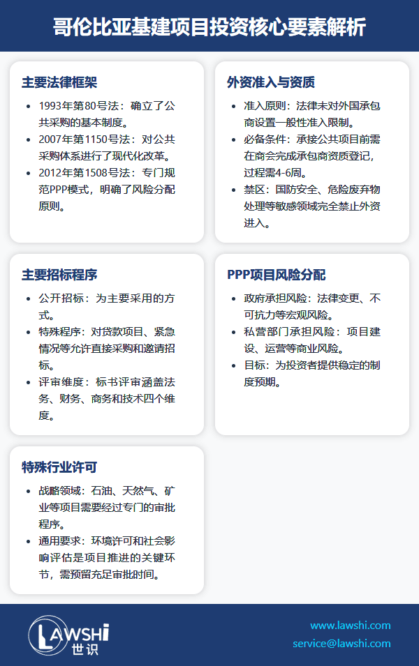 哥伦比亚基础设施领域采用政府与社会资本合作(PPP)为主导的发展模式,通过1993年第80号法、2007年第1150号法和2012年第1508号法构建了完整的法律框架。对于计划进入哥伦比亚基建市场的中国企业而言,深入理解其独特的招标程序和监管要求至关重要。