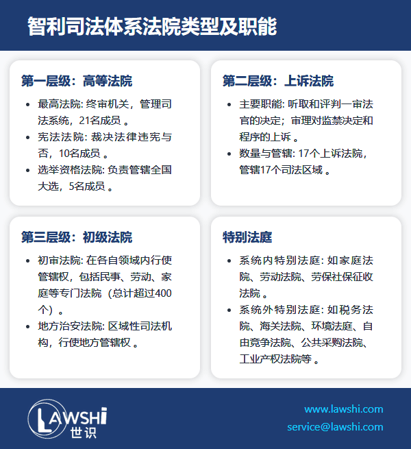 此外,智利还设有多类特别法庭(如税务法院、环境法庭、自由竞争法院等),专门处理特定领域的争议,其中部分隶属于司法系统,部分则为独立体系。