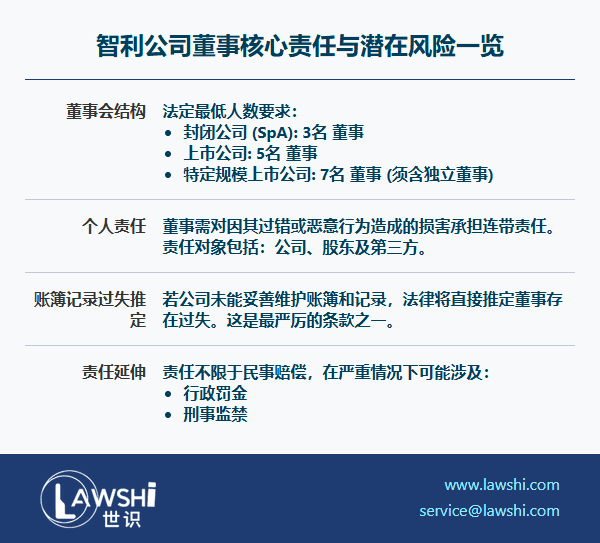 智利的《公司法》对股份有限公司的董事会架构有明确且强制性的规定。与一些离岸地或更为灵活的法域不同,在智利设立公司并非简单地指定一名代表即可。法律明确规定,封闭公司(SpA)至少需设三名董事,而上市公司则至少需要五名。值得注意的是,当上市公司权益达到一定规模且股权分散度符合标准时,董事会成员需增至七名,并必须任命独立董事和设立董事委员会。
