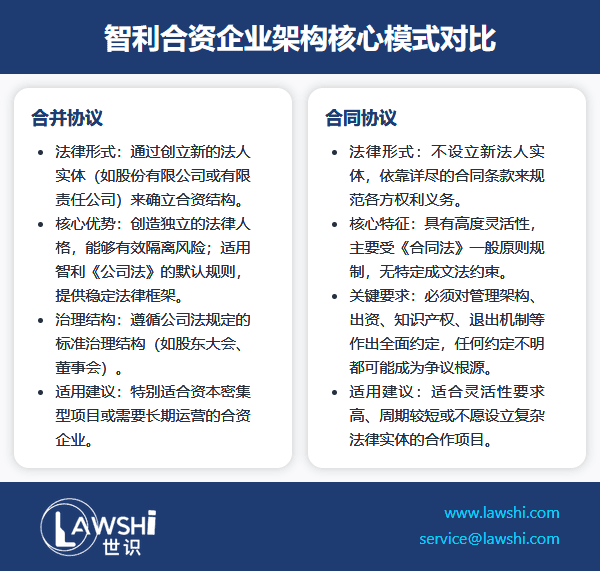 合并协议方式创造了独立的法律人格,能够有效隔离风险,并适用智利《公司法》的默认规则。建议资本密集型项目或需要长期运营的合资企业优先考虑此种模式,以获得更稳定的法律框架。