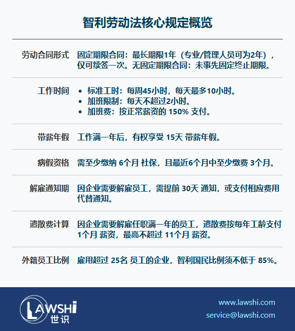 智利劳动合同主要分为无固定期限合同、固定期限合同以及以特定工程或服务为标的的合同。其中,固定期限合同最长不得超过一年(管理层或技术人员可延长至两年),且仅可续签一次。若连续签订两次固定期限合同,或合同期满后雇员继续在雇主知情的情况下工作,合同将自动转为无固定期限合同。以工程为基础的合同,其效力持续至约定工作完成,终止条件法律有严格限定。