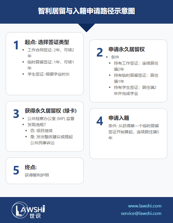 永久居留权(绿卡):满足相应的居住年限后(工作签2年,临时签1年),即可申请永久居留。获得永居后,您可以无限期地在智利生活、工作和学习,权利与公民基本相同。
